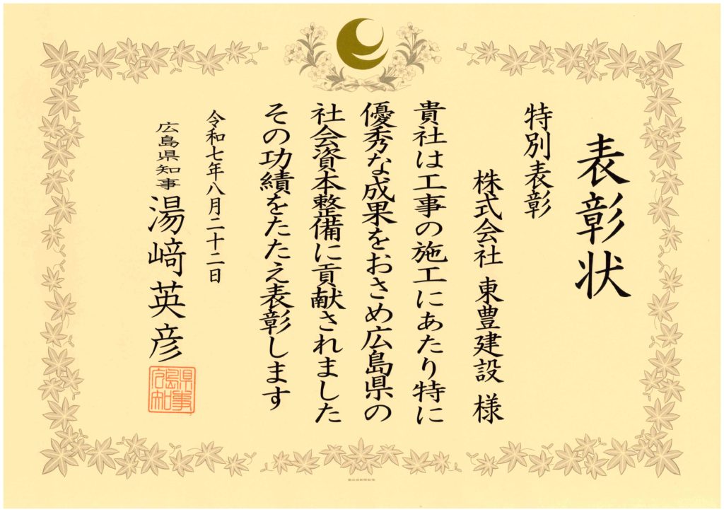 令和7年8月22日に広島県より「優良建設業者」として表彰されました。
